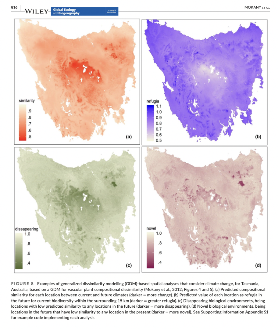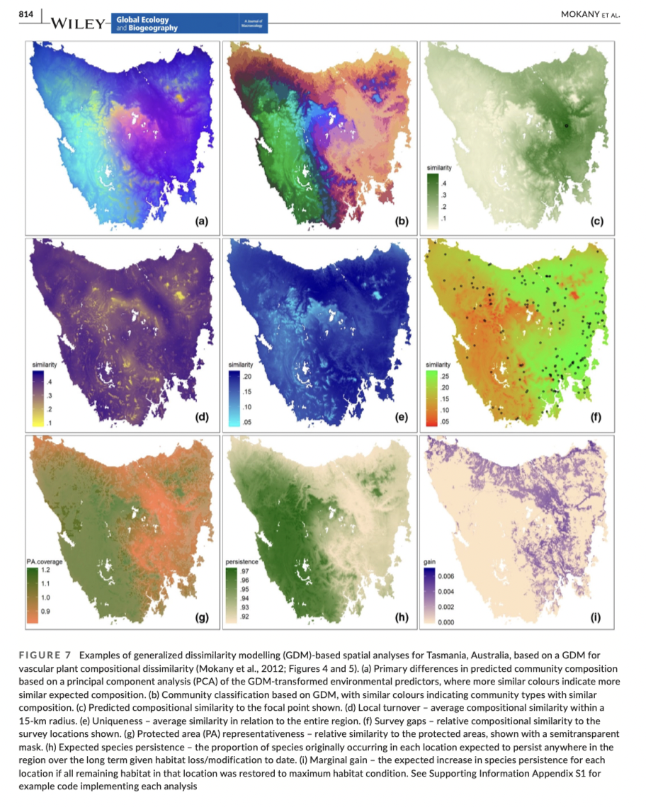 - Mokany, K., Ware, C., Woolley, S. N. C., Ferrier, S., Fitzpatrick, Matthew C., & Bahn, V. (2022). A working guide to harnessing generalized dissimilarity modelling for biodiversity analysis and conservation assessment. _Global Ecology and Biogeography, 31_(4), 802-821.