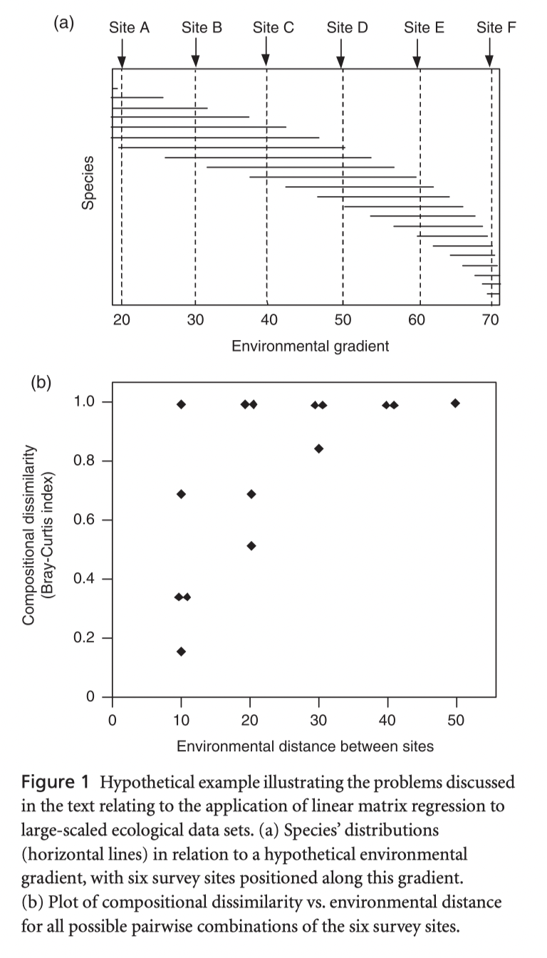 GDM is non linear extension of matrix regression that uses dissimilarities in both predictor and response variables: