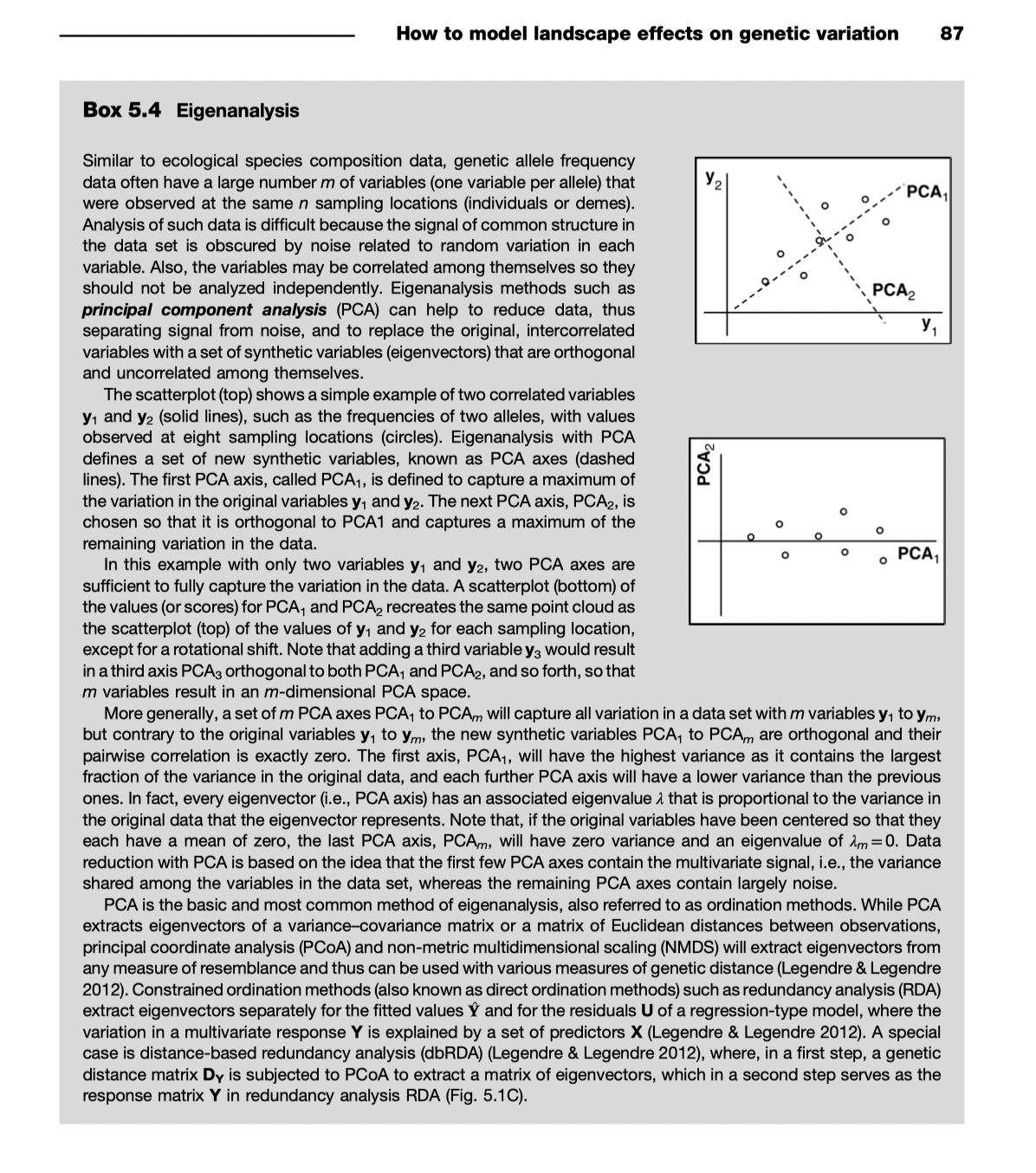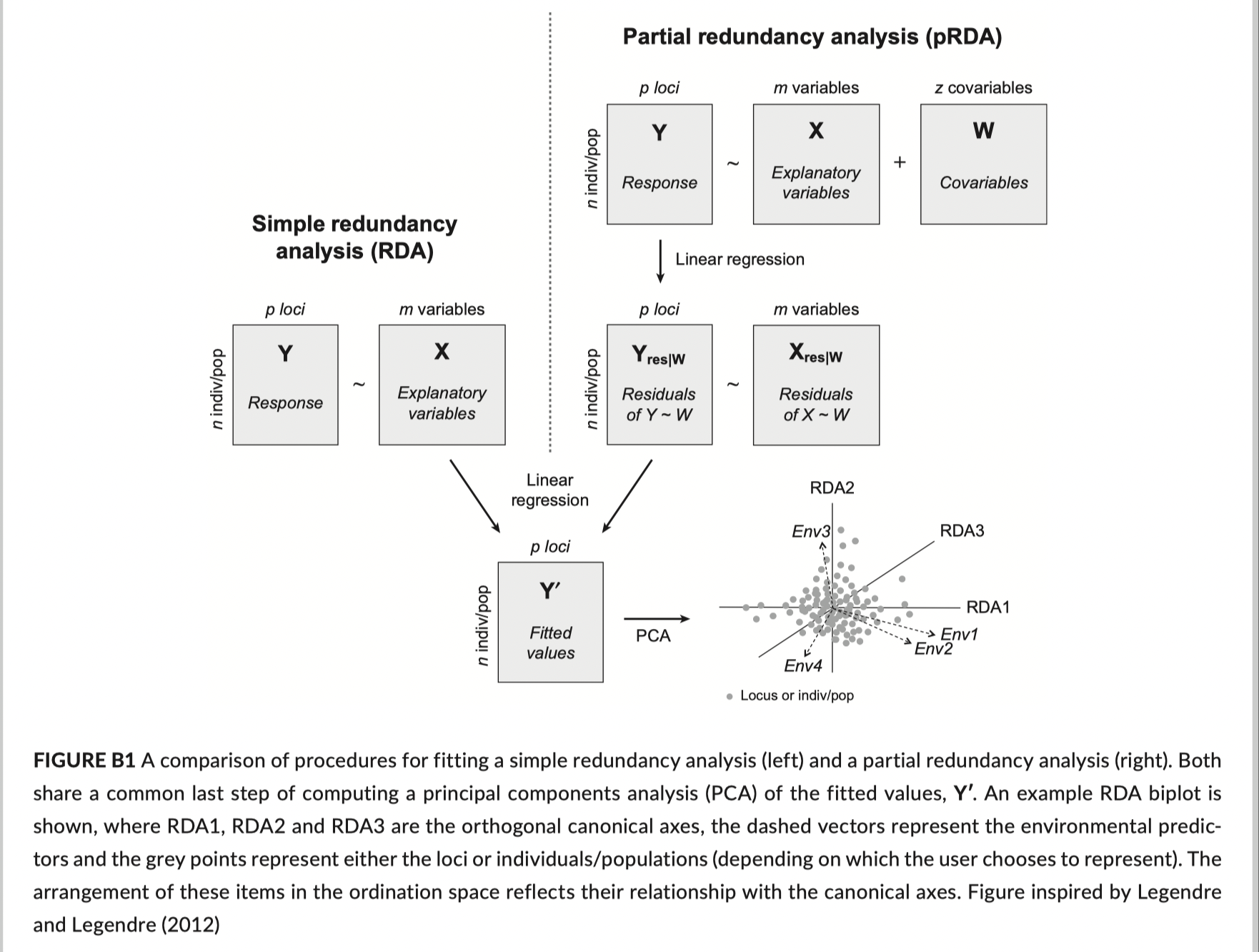 RDA was developed for community ecology data and has been adopted for genetic analyses. In an ecological analysis, there will be various spatial and environmental predictive variables (n sites by m predictive variables) and biological response variables (typically, species abundance organised in n sites by p species). Much of the literature about using ordination and multivariate analyses for environmental analyses will be described as ecological communities).