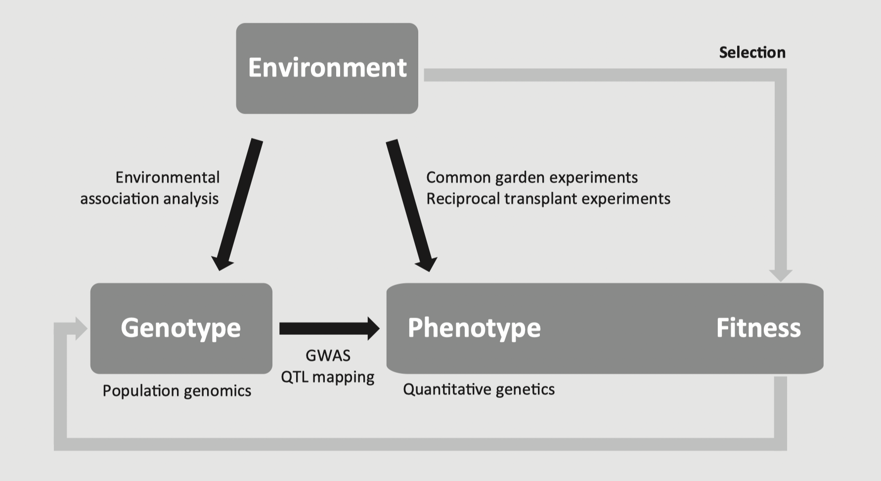 There is a huge literature on the topic of finding candidate loci for environmental selection that we cannot cover in one week. Population genetic tests of selection such as outlier tests or genomic scans are frequently used. There are also tests of selection that specifically look for associations of individual loci to environmental attributes - often called GEA, genotype-environment association or EAA, environment association analysis - this will be more of our focus given that we are studying landscape genomics. We will come back to this topic on Friday. (Rellstab et al. 2015 and Storfer et al 2018 have good reviews of the various methods if you are looking for further reading on this topic.)