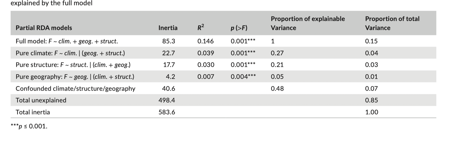 #anova(pRDAclim)Take a look at pRDAclim and you will see how Inertia is partitioned among various categories. Information from this model is feeding into the second row of Table 2.