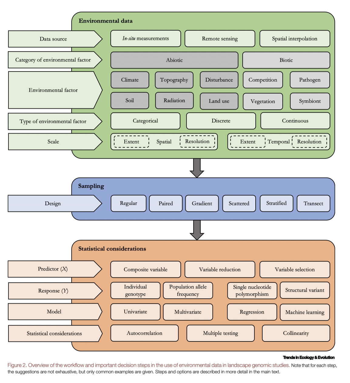 Dauphin, B., Rellstab, C., Wuest, R. O., Karger, D. N., Holderegger, R., Gugerli, F., & Manel, S. (2023). Re-thinking the environment in landscape genomics. Trends Ecol Evol, 38(3), 261-274. doi:10.1016/j.tree.2022.10.010