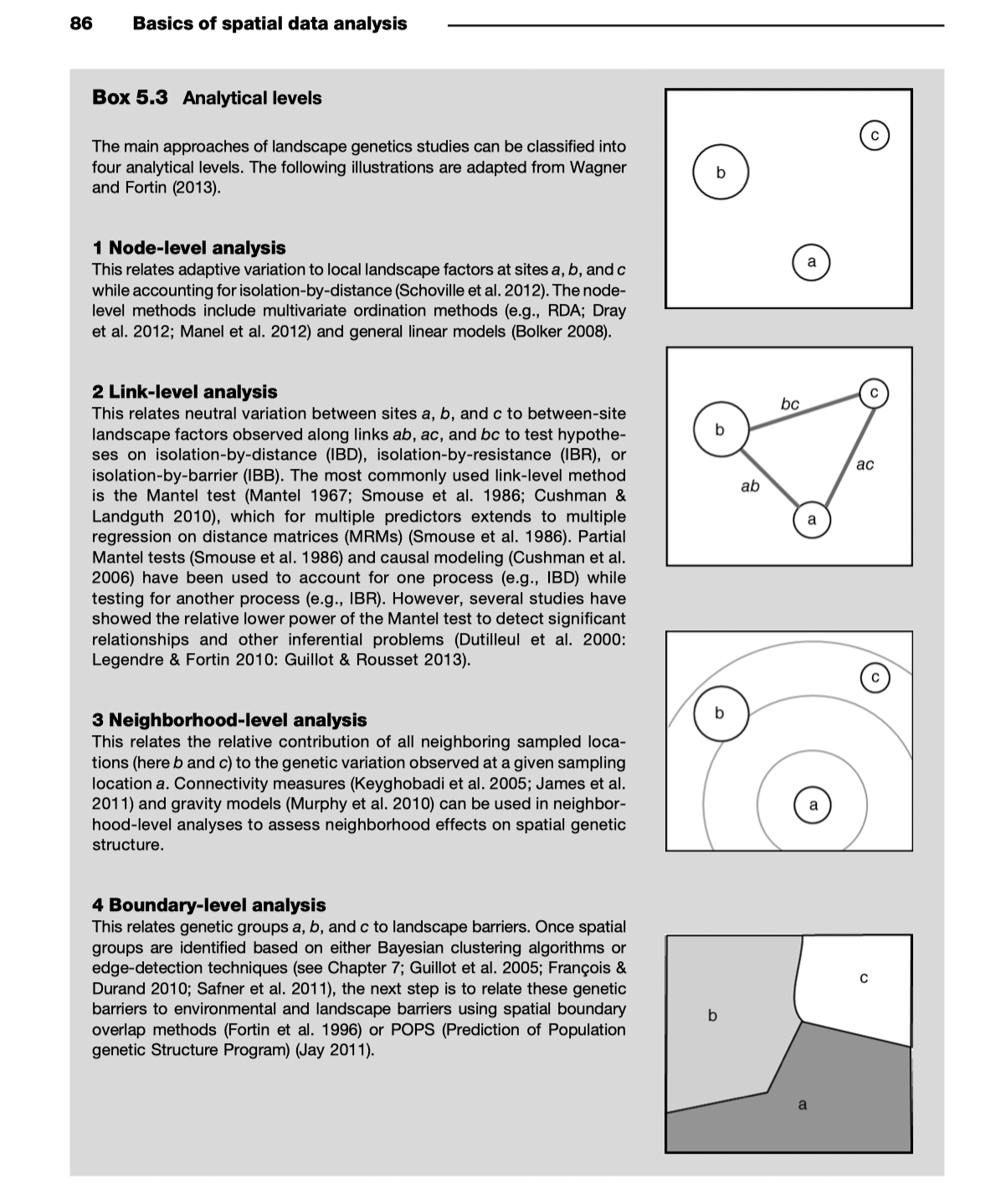 Wagner, H. H., & Fortin, P. D. M.-J. (2016). Basics of spatial data analysis: linking landscape and genetic data for landscape genetic studies. In N. Balkenhol, S. A. Cushman, A. Storfer, & L. P. Waits (Eds.), Landscape Genetics: Concepts, Methods, Applications (pp. 1-22): John Wiley & Sons, Ltd.