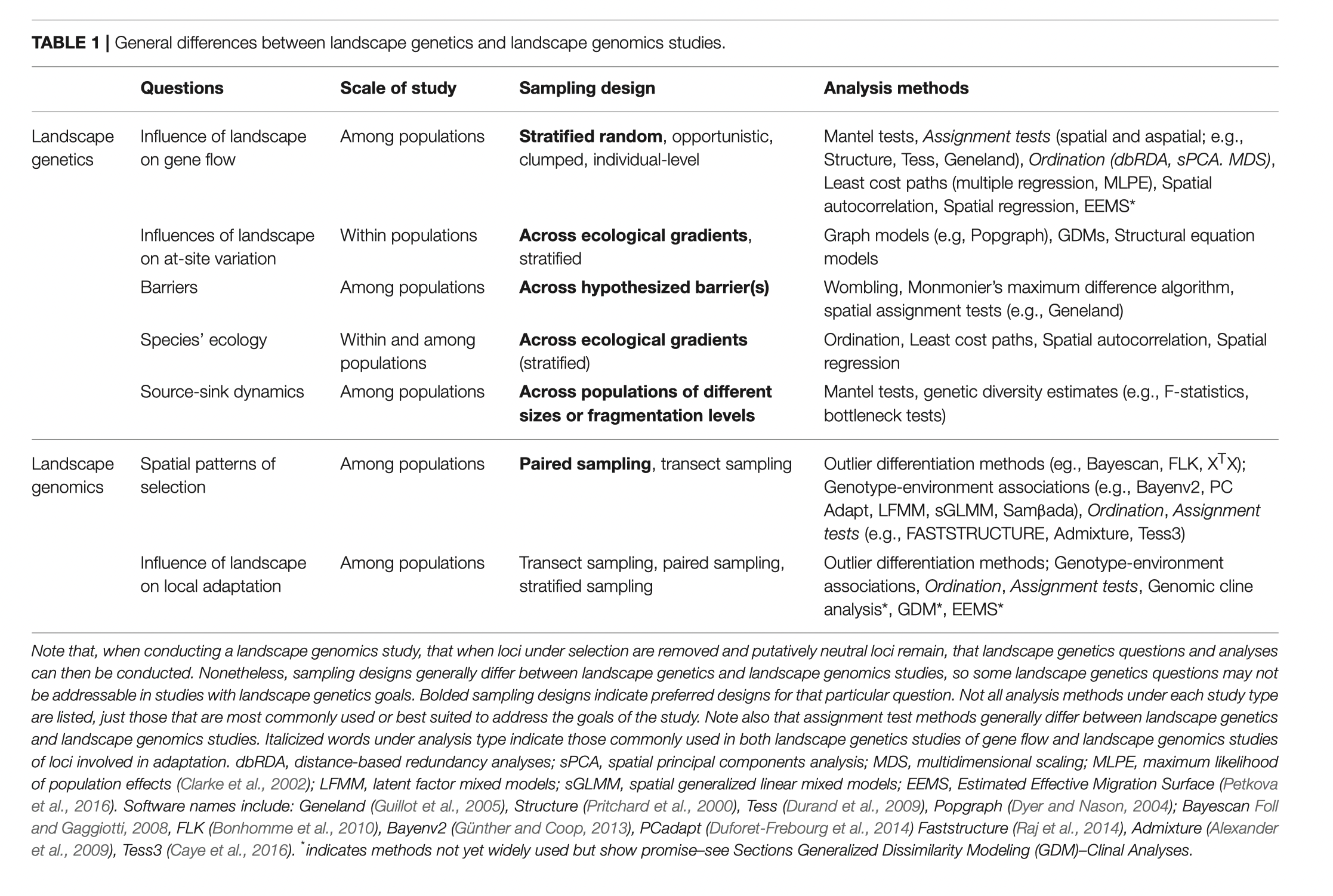 Storfer, A., Patton, A., & Fraik, A. K. (2018). Navigating the interface between landscape genetics and landscape genomics. Front Genet, 9, 68.
